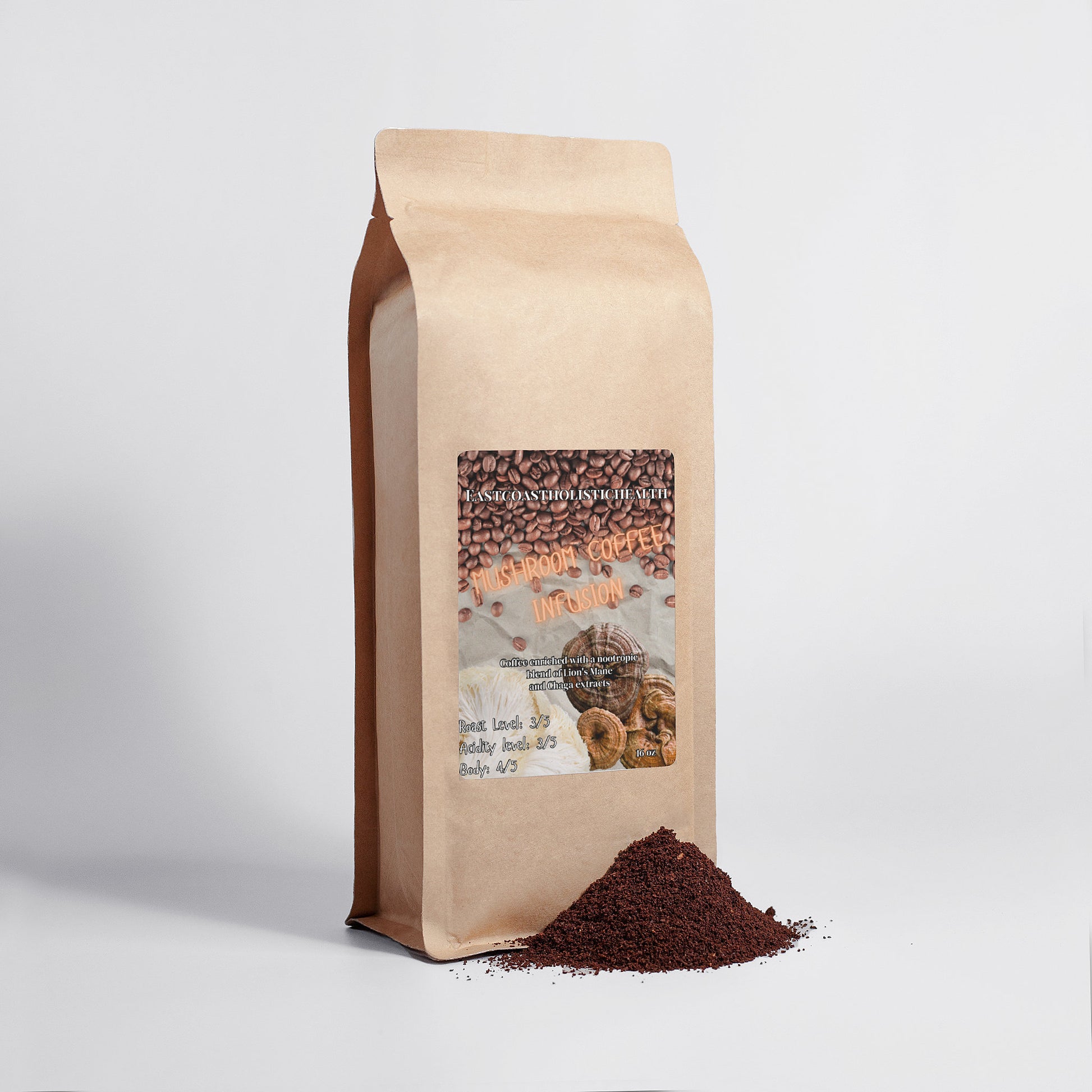 Ingredients: Arabica Coffee, Lion's Mane Mushroom Powder, Chaga Mushroom Powder.