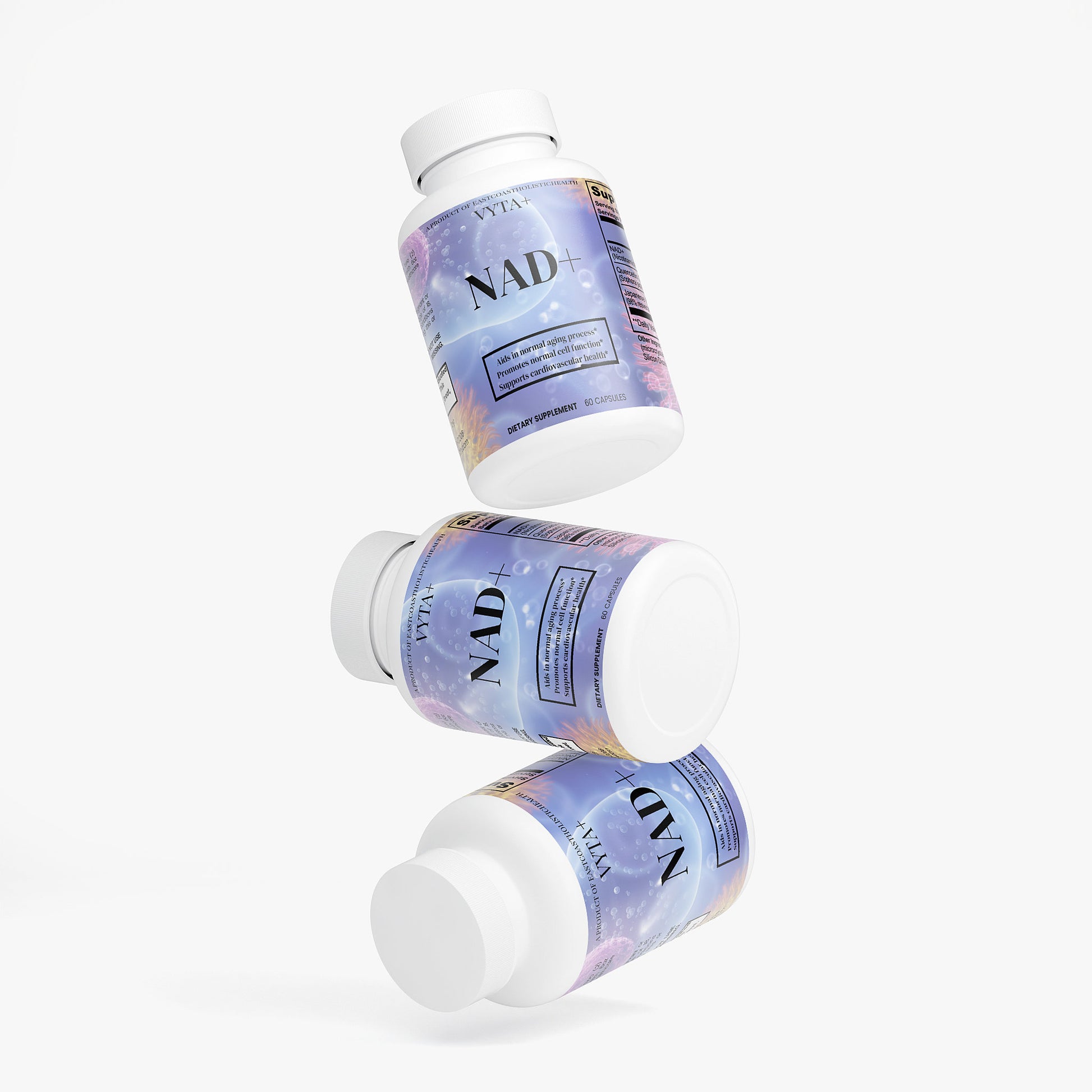 Quercetin, a natural flavonoid, helps promote a normal inflammatory response and supports optimal immune function. Resveratrol, sourced from Japanese Knotweed, is known for its role in supporting cardiovascular health and helping maintain cognitive wellness. Together, these ingredients complement NAD+ to help sustain energy and promote cellular resilience.