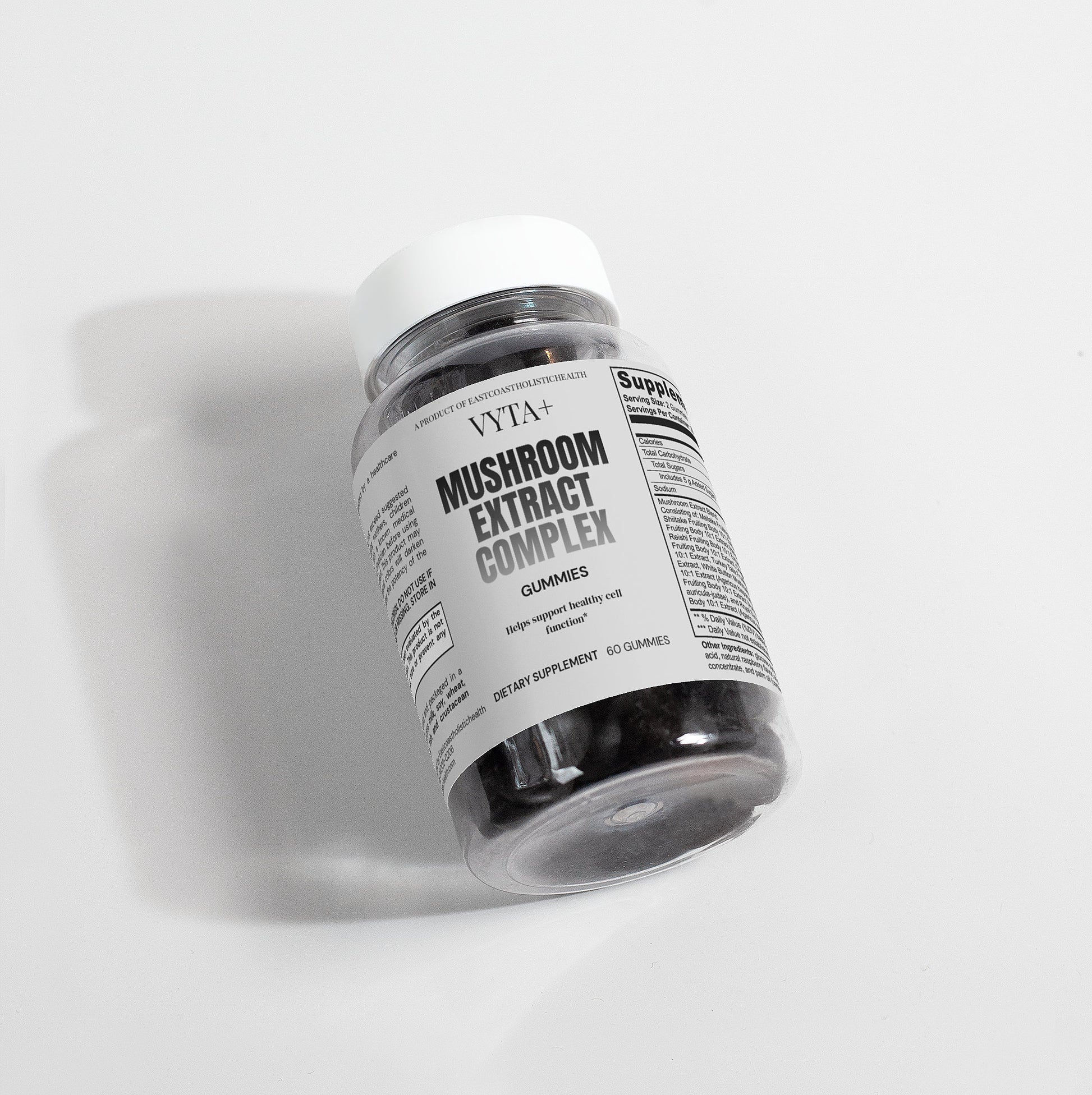 Ingredients: Mushroom extract (Maitake Fruiting Body 10:1 Extract, Shiitake Fruiting Body 10: 1 Extract, Lion’s Mane Fruiting Body 10:1 Extract, Reishi Fruiting Body 10:1 Extract, Cordyceps Fruiting Body 10:1 Extract, Chaga Fruiting Body 10:1 Extract, Turkey Tails Fruiting Body 10:1 Extract, White Button Mushroom Fruiting Body 10:1 Extract, Black Fungus Fruiting Body 10:1 Extract, Royal Sun Mushroom Fruiting Body 10:1 Extract), glucose syrup, sugar, dextrose, pectin, citric acid, natural raspberry flavor, sodium citrate, purple carrot juice concentrate, palm oil (contains carnauba wax).
